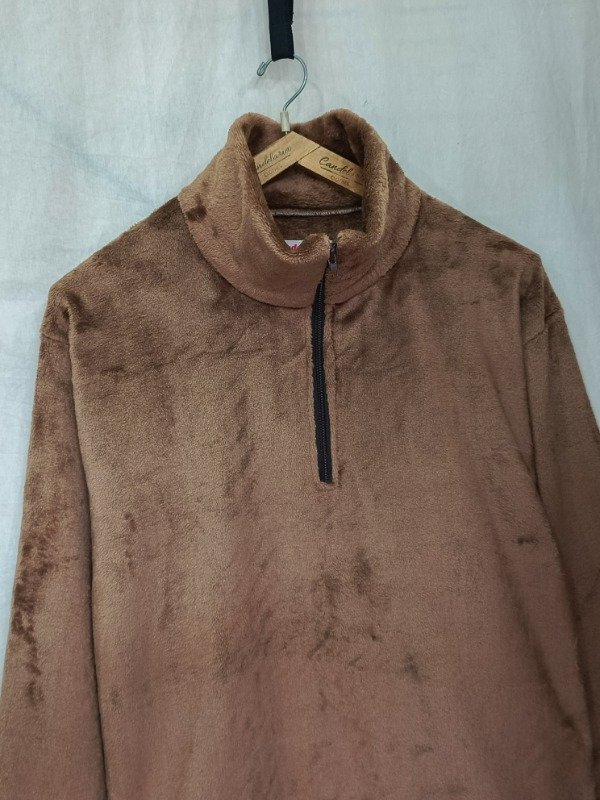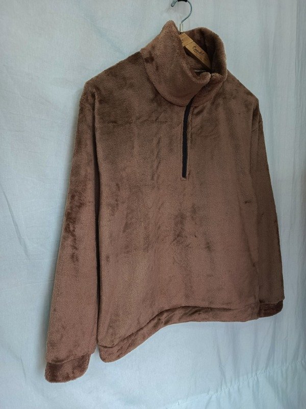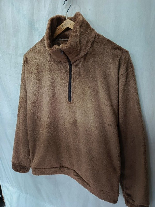 Confeccionado en polar soft chocolate brilloso, es amplio, cómodo de estilo oversize muy abrigado.