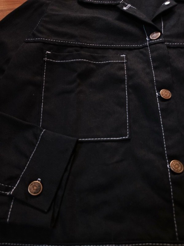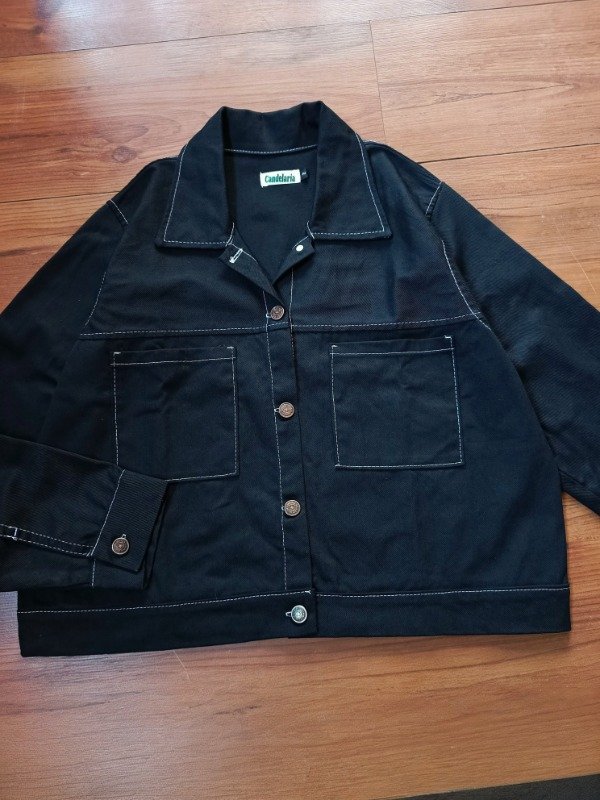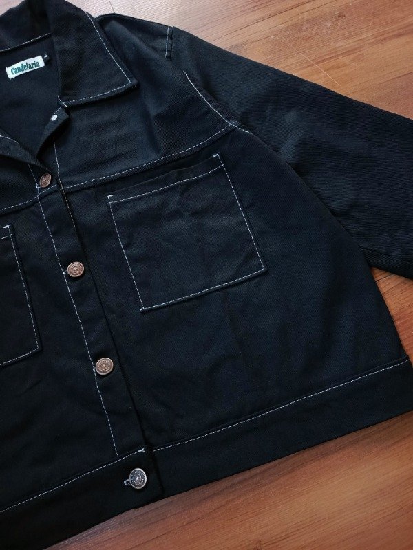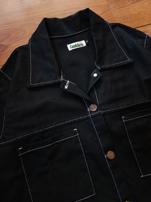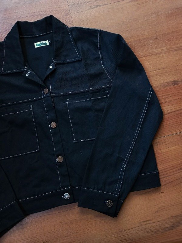 Campera de gabardina negra rígida con pespunte a contratono (blanco).