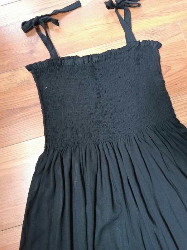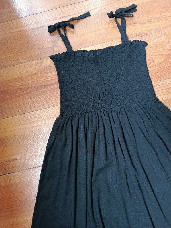 Vestido frunce con breteles regulables confeccionado en lino negro elastizado